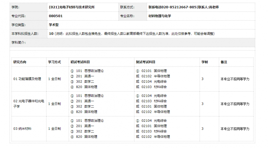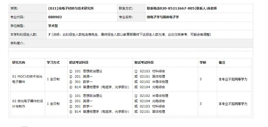 注意:在阅读调剂信息之前,明确提示:想申请调剂的学生务必要按下文要求发送邮件申请,第三方渠道恕不受理和回复!谨记!! 光电子材料与技术研究所2019年硕士研究生招生调剂信息 光电子材料与技术研究所2019年硕士研究生招生调剂信息 华南师范大学是国家“211工程”重点建设大学。"光学和光电子学科"是国家光学重点学科,被列入华南师范大学"211工程"第一层次重点支持和建设的学科项目。重点实验室配有光学、光学工程、微电子与固体电子学、材料物理与化学硕士点,光学、微电子学与固体电子学博士点,物理学博士后流动站。光电子材料与技术研究所培养研究生实力雄厚,拥有光学和微电子与固体电子学两个博士学位授权点和物理学一级学科博士后流动站,有光学工程、微电子学与固体电子学、材料物理与化学三个学术型硕士学位授权点,以及光学工程(专业学位)硕士学位授权点,已形成硕士—博士—博士后完整的光电材料学科人才培养体系,是广东省重要的光电子材料学与光电子器件人才培养基地,现已建成广东省微纳光子功能材料与器件实验室、广东省教育厅电致光电器件重点实验室、广州市led工业研发基地等。 详情请参考材料所主页:https://iomt.scnu.edu.cn/index.html 本所接受硕士调剂生,专业如下: (080300)光学工程 (080501)材料物理与化学 (080903)微电子学与固体电子学 (085202)光学工程(专业硕士) 如果原报考专业的代码跟上述四个某一个相近(即前四位相同),即可申请调剂,其余的可斟情考虑。 关于我所接受硕士调剂生的说明: 一、调剂需知:考生必须确保所提供的信息属实;欲调剂考生首先必须确认不能被第一志愿单位录取;考生初试成绩:单科及总分达到a类地区国家线;考生第一志愿统考科目应与申请调剂的专业要求相近;必须参与数学全国统考,即没有考数学或者考数学一/二之外的数学并不纳入考虑范围。 二、凡申请调入我所的考生请到我单位网站(https://iomt.scnu.edu.cn/index.html)的“通知公告”栏目或本贴二楼下载新版本《光电子材料与技术研究所接收调剂信息表》(附件一)和《硕士研究生调剂申请表》(附件二),并按要求填写。信息填写完整后,将①《附件一:调剂信息表》、②《附件二:调剂申请表》及③《本科成绩单电子版》、④《考研成绩电子版(照片、截图均可)》4份材料,以附件的形式发送至:cls@m.scnu.edu.cn ,邮件主题格式为“姓名+初试总分成绩(每科成绩)+申请调剂的第一志愿专业(代码)+本科学校名称”,如“张三 343(数学一/二 100;英语73;政治 70;专业课 100) 材料物理与化学(080501) XX大学 ”,请严格按照指定格式和要求发送申请,否则可能影响调剂信息查看及录取。 三、凡申请调剂到我所的考生,届时由专业指导组按调剂生申请先后、初试与复试成绩等因素综合考虑在复试考生中由高到低列出拟录取名单,排名前列的为公费生。 四、申请考生的有关材料(成绩单原件、政审表等)暂无需寄送,等接收到我所复试通知具备复试资格并通过国家调剂系统确认后再快递到我办。其他有关研究生招生和调剂的信息请密切留意华南师范大学研究生处发布的有关要求和手续。 五、如有四六级证书和个人简历,请附上 调剂信息投递邮箱:cls@m.scnu.edu.cn 通讯地址:广州市天河区石牌华南师范大学光电子材料与技术研究所研工办收(邮编:510631) 注:所有按要求投递的申请信息,我们都会尽快查看,通过初选的考生,我们会通过邮件方式或电话等方式通知复试(说明:由于邮件系统分类问题,往年部分邮箱系统会将本邮箱发出邮件认定为广告或垃圾邮件,请同学们时刻关注邮箱所有分类,以免耽误调剂)。 由于小木虫也开放一个申请调剂的入口,导致这边信息对接不完全,因此在此提醒一下,希望全部都通过邮箱申请调剂,而不是通过小木虫的通道,并按照通知要求填写相应的材料!!!!!!!!!!!!!!!!!!!!!!!! 若有简历和四六级证书,请附上并发送过来。 相关材料见置顶楼层,注意:填写数学和英语成绩时必须标注一或二。 光电子材料与技术研究所 二○一九年二月二十一日 [ Last edited by zairenjian on 2019-2-21 at 12:24 ] |