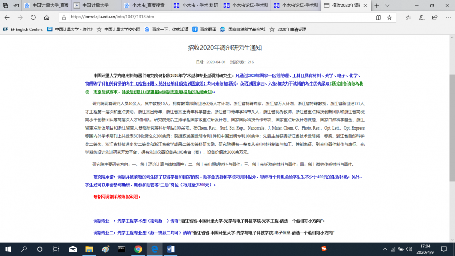 欢迎报考与调剂中国计量大学光学与电子科技学院下属光电材料与器件研究院的硕士研究生,数一考生可报光学工程的学硕,数一和数二考生均可报光学工程(电子信息)的专硕,科研方向有上转换发光、发光材料与器件、光纤激光材料与器件、光电传感检测材料与器件、光催化剂等。联系方式如下:邮箱19A0402170@cjlu.edu.cn,网址https://iomd.cjlu.edu.cn/或https://yjsb.cjlu.edu.cn/yjsy/zsnet/。 研究院首页.png 招收调剂研究生通知.png |