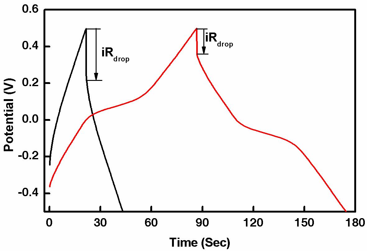 大家做超级电容器两电极体系测试时的电压降大吗?电压降有多少?