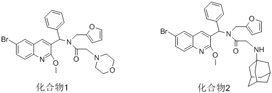 1H NMR ( 500 MHz, CDCl3) ¦Ä: 2.47~2.57(m, 4H, 2¡ÁNCH2); 3.27~3.29(d, 1H, J=13.5Hz, COCH2-¦Â); 3.41~3.44(d, 1H, J=13.5Hz, COCH2-¦Á); 3.44~3.47(m, 4H, 2¡ÁOCH2); 4.10~4.43(d, J=15.5Hz, 1H, NCH2); 4.93~4.96(d, J=15.5Hz, 1H, NCH2); 5.75(s, 1H, furan-H20); 6.02(s, 1H, furan-H21); 7.68(s, 1H, furan-H22); 3.89(s, 3H, OCH3); 7.05(s, 1H, ArCH); 7.13~7.14(d, 2H, C6H5-H2,H6); 7.26~7.28(m, 1H, C6H5-H4); 7.35~7.37(m, 2H, C6H5-H3,H5); 7.37(s, 1H, quinoline ring-H7); 7.39(m, 1H, quinoline ring-H2); 7.65(m, 1H, quinoline ring-H3); 7.73(m, 1H, quinoline ring-H6).