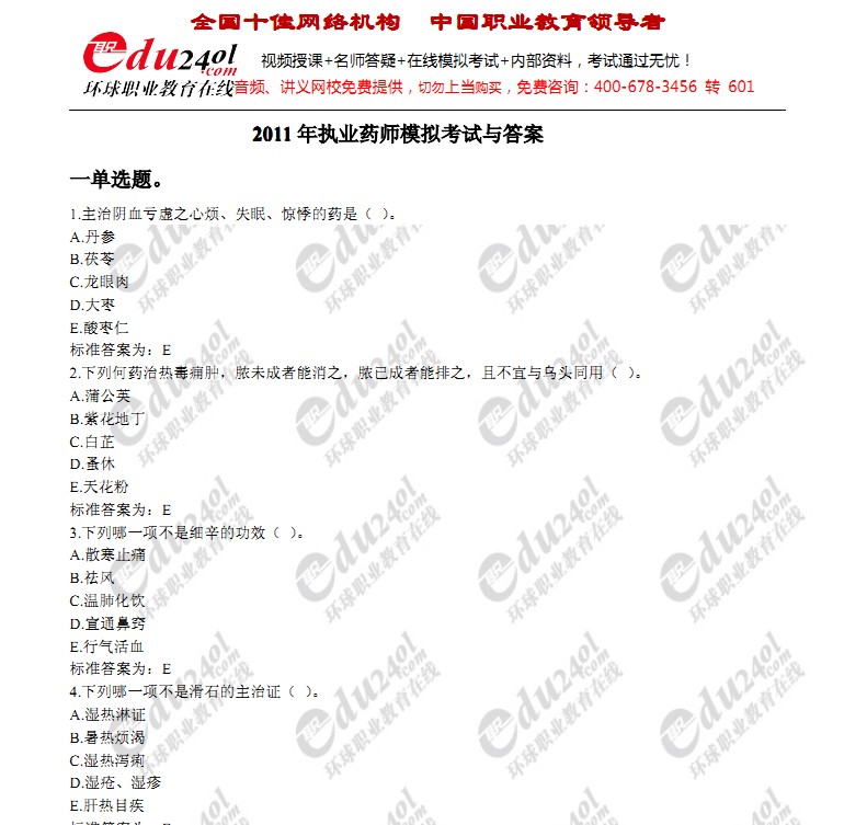 【模拟试题】2011执业药师模拟考试与答案(中药类)