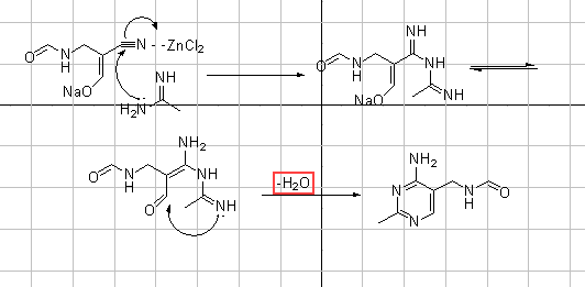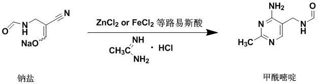 将100克钠盐(82%,552 mmol)置于装配有回流冷凝器、磁力搅拌器和氩气供应的三口、圆底500 mL烧瓶中。先后添加盐酸乙脒(64.5克,662 mmol,1.20当量)、ZnC12 (19.9克,0.26当量)和300 mL的3-戊酮。将混合物在转速为300 rpm,氩气、88 ℃(内部温度)下进行搅拌。19小时后,在低压、40℃的浴温下除去溶剂,并通过HPLC和NMR对粗制反应混合物进行分析。基于钠盐,甲酰基嘧啶的产率为74% 。