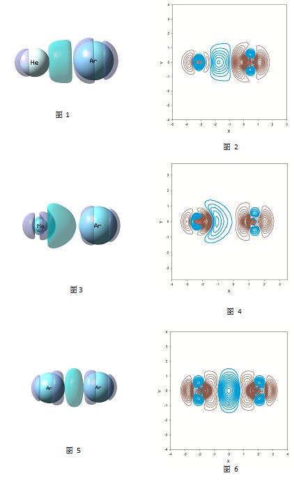 (此外,在Δρ图,除了在Ne 或者Ar的背后看到密度增加之外,如果将等值面或等值线的起始绝对值进一步取小,还会看到月芽形的密度减少。这是由于作的是全电子密度差,当Ne或者Ar图取Px-Px成键时,必然也包含Ne或者Ar的Py和Pz,它们也正在Ne或者Ar的背后,由于Ne或者Ar背后密度的增加、对核的屏蔽会增加,核对Py和Pz的吸引会减弱,从而使Py和Pz有点膨胀、密度有所降低,呈月芽形的密度减少,成键前后的Py和Pz微有变化,并没有完全被抵消。)
