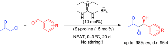 The combination of proline and an achiral triazabicyclodecene-derived guanidinium salt permits, for the first time, the direct aldol reaction of chloroacetone and aromatic aldehydes (see scheme). The resulting chlorohydrins are formed with high regio-, diastereo- and enantioselectivity. This procedure is experimentally simple and green, working without solvent, in test tubes placed inside a standard laboratory fridge without agitation or mechanical stirring.