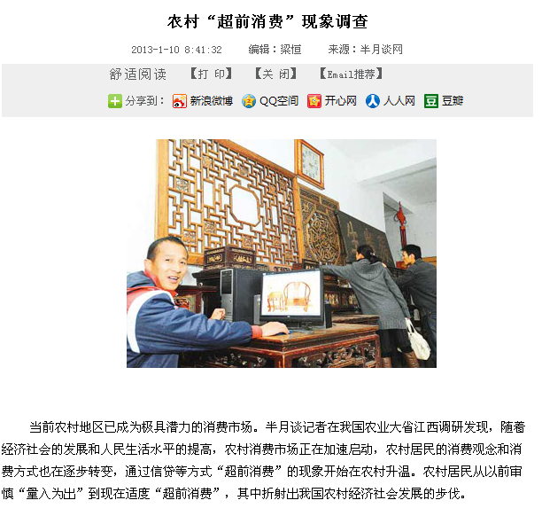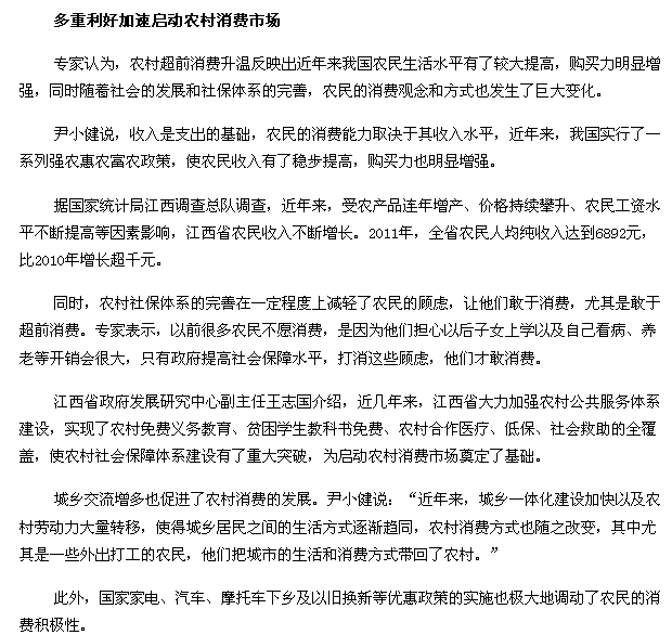 城里人都买不起房了,拉不动内需了,现在想到让农民掏腰包买点消费品,刺激增长。说是,改善人民生活,其实是让人民学会花钱,学会掏出家底儿来够买消费品。。经济循环的怪圈,最后又回到了广大农民身上,又回到了土地的本源。不让人民交税收,变着法子让人民拿钱消费。。大的经济趋势里面, 基层的生活水平到现在才纳入领导层面,太慢了点。。讲了这么多,是不是有点消极了,