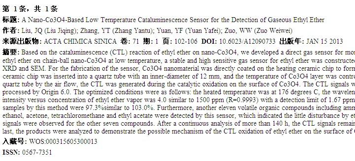 求助化学学报《基于纳米Co3O4 低温催化发光的乙醚传感器》论文的检索号