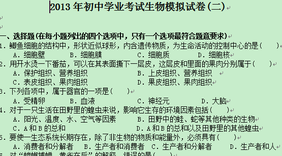 2013年初中学业考试生物模拟试卷2.doc 说明: 宜宾市用 [ 来自小组 夜行侠部落 ] [ Last edited by zhweijun88 on 2013-5-31 at 00:08 ]