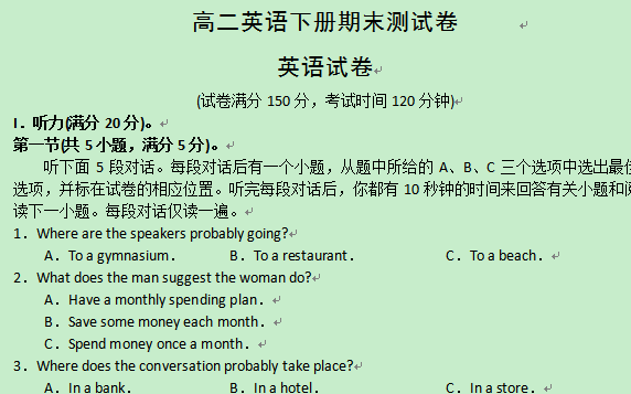 【高二期末】河北衡水高二英语下册期末测试卷01 [ 来自小组 狼族传说 ] [ Last edited by zhweijun88 on 2013-6-2 at 18:24 ]
