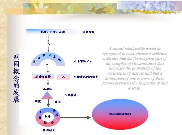 病因是一个复杂的概念 但病因在不同的背景下有不同的定义,在医学的各学科中,没有一个同等的固定的定义。 在流行病学的长期实践中,随着医学科学技术的发展以及人们对疾病的认识的深入,逐步形成了较为系统的因果观念。