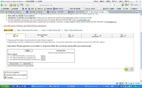 第一次在journal of chemical physics 上投稿,请教为什么我在上传文件时点“upload files”时网络没有反应呢?文件并没有上传啊?这是怎么回事?在线等待帮忙!急!另外,怕我描述的不够清楚,我已经把提交的这一页放在附件里了!谢谢各位! 11.jpg 返回小木虫查看更多