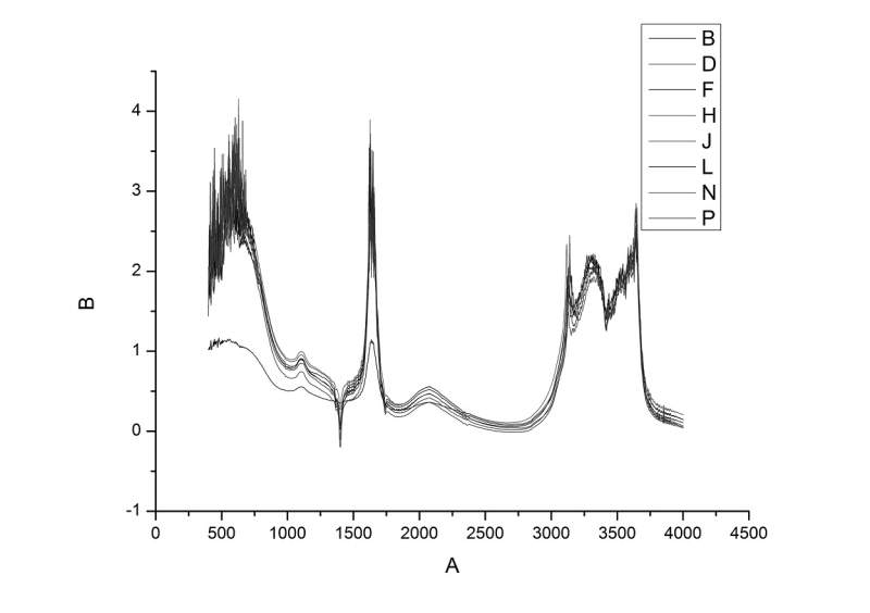 请各位大神怎么分析以下红外图呢 是八个不同溶液里面的同一物质 Graph2.jpg 返回小木虫查看更多
