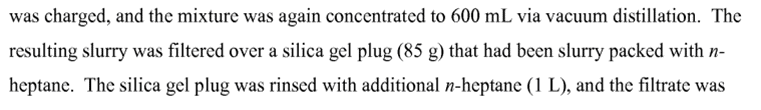 向85g硅胶里加正庚烷,搅成浆状,减压下倒入布氏漏斗,再把浓缩好的浆状物倒入硅胶漏斗过滤,最后再用1L正庚烷淋洗