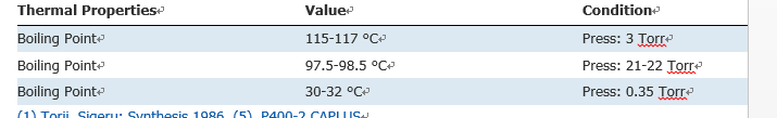 CA上的信息我 已经下载下来了,请懂得同学看下 1.这个化合物在1atm和旋转蒸发仪上(-1atm)的沸点是多少 2.主要想知道该产物的二氯甲烷溶液在浓缩时,产物会不会也被带出去 化合物为2-甲酰-3-氧代-丙酸乙酯 1.png 2.png 返回小木虫查看更多