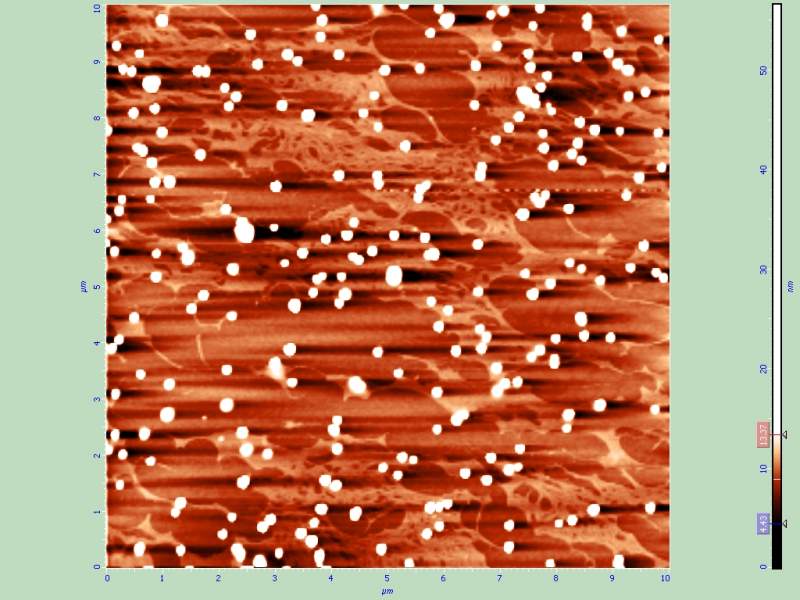 第一幅图中,你看到的拖影问题是由于数据处理中使用平滑而导致(叫flattening或者leveling)。 其原理是这样的: 由于大部分基底本身有一个倾角, 所以扫描出来的图片如果不做平滑处理,那么就会出现结果一边高一边低的情况。表现在图像上就是从一边亮,一边暗。 因此,为了得到样品的精细结构,就必须对每一条扫描线进行拟合,y=a*x。 然后从原始数据中减去这条拟合曲线。 由于系统无法区分基底跟真实样品,所以拟合出来y=a*x就会有很大的误差, 导致减去的拟合线后的结果在真实凸起样品部分会有阴影。 不知道我这样解释,你明白没有?