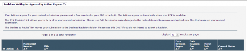 修改后上传时,在Revisions Waiting for Author's Approval一步中显示的是:“If no Actions appear for your revised submission, please wait a few minutes for your PDF to be built. The Actions appear automatically when your PDF is available.