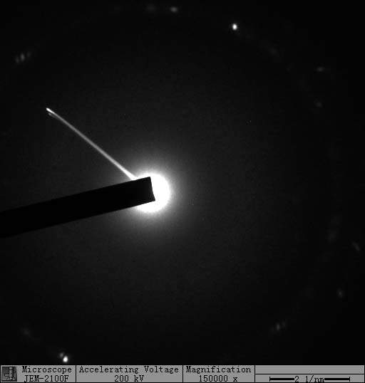 最近做了一个TEM,打了电子衍射,从这个图大致能看得出来是多晶结构,量了半径确定晶面的面间距d。但是我不太明白的是衍射图的中间的那个非常明显的直线什么,也代表一种晶型吗?能不能量取半径求呢?看文献的电子衍射图都没有,还是仪器的原因?谢谢啦!