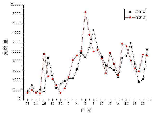 下图为2014年、2015年6月22日-7月21日期间,基金申请版的发帖统计情况。除了一点波动以外,二者基本类似。 说明今年的情况基本跟去年类似,虽然出台个保密条例,但是也没什么卵用。 返回小木虫查看更多