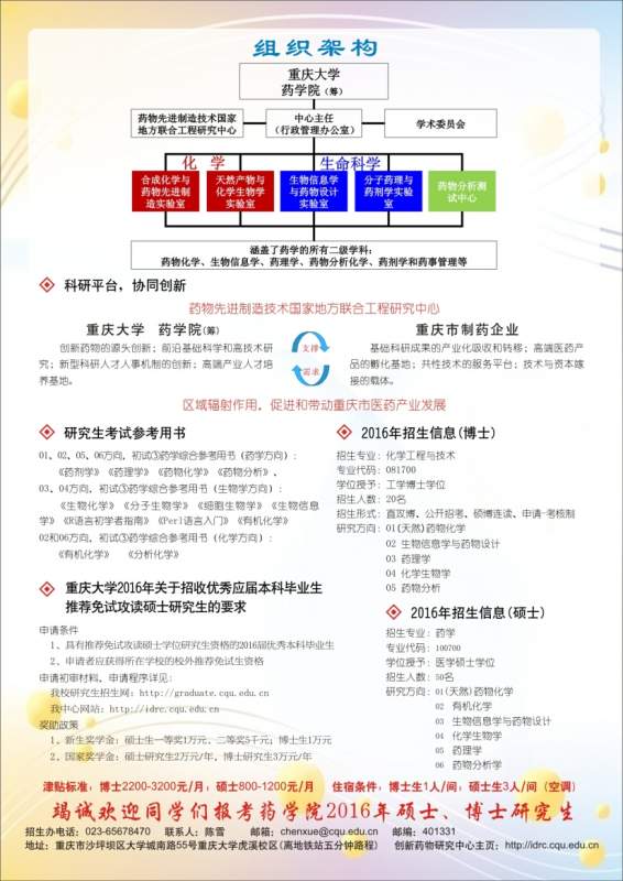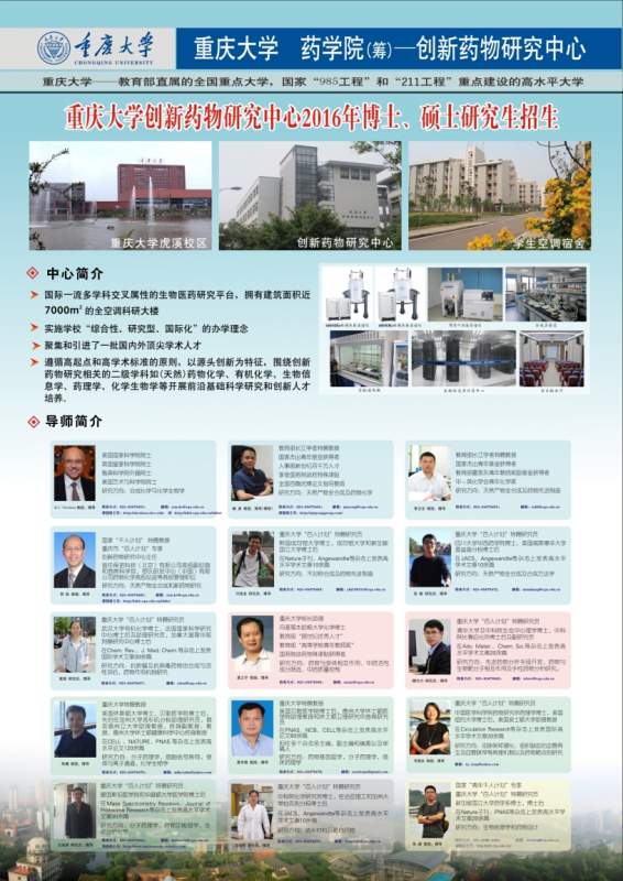 2016年重庆大学创新药物研究中心招生简章(硕+博)
