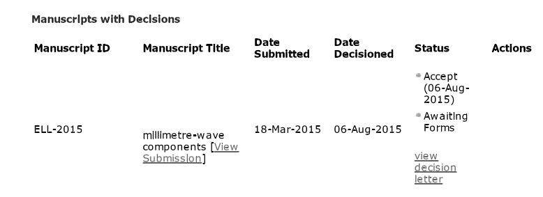 We are very pleased that your paper has been accepted for publication in Electronics Letters. However, I have yet to receive an online copyright form from you, which may delay the publication of your letter.