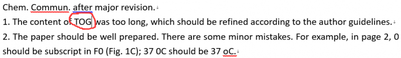 由于是审稿人建议是根据author guideline把TOG缩短。 所以TOG肯定不是某种表征技术缩写。 极有可能是图标,图住,TOC(Table of content),审稿人笔误? 或者每篇文章不是有一段话简介吗?或者是那个? 实在不行就去问编辑。RSC都是专业编辑,会回复你的。