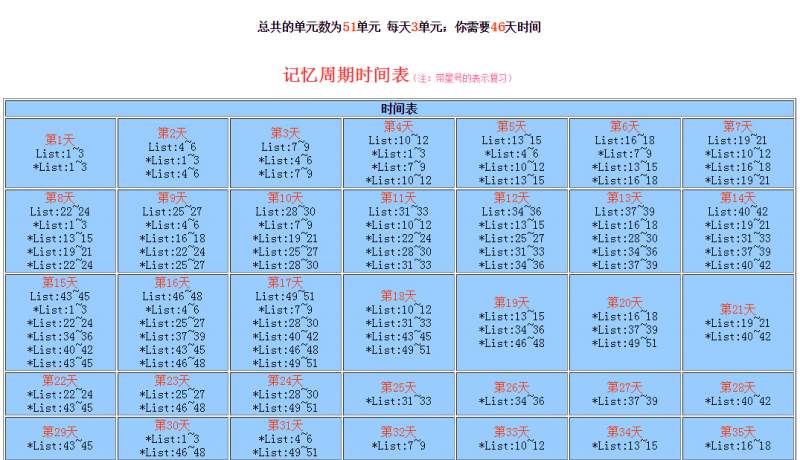 本背单词的方法参照杨鹏的《十七天搞定GRE单词》,输入总的单词单元数和每天背诵的新的单词单元数,如图: 就可以制作出 背单词的记忆周期时间表,可以选择打印或保存为pdf。 时间表.jpg
