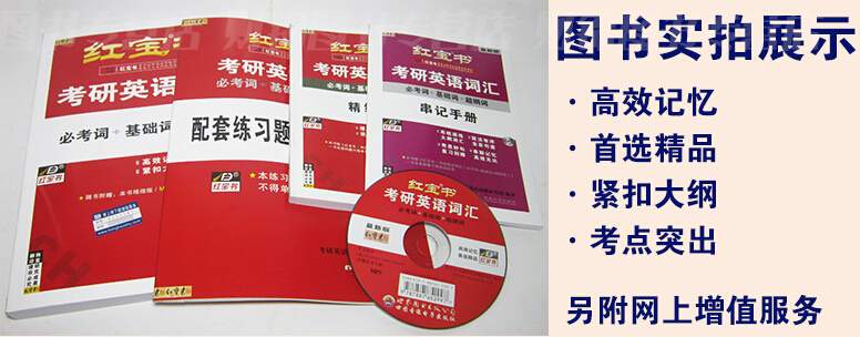 1.【红宝书】考研英语词汇(必考词+基础词+超纲词)这本书是我觉得目前最好的考研英语词汇书,包括了5500余个大纲词汇,这本书严格按照考研英语最新大纲要求,运用英语测试学及统计学原理,在深入研究历年真题及考研英语命题规律的基础上,对考研英语大纲词汇进行了深入地分析和研究,将考研词汇按其重要程度区分为:必考词、基础词、超纲词等,并且重点突出必考词,深入剖析必考词,反复练习必考词。使考生能够分清主次,并抓住考研词汇的重中之重,省时、省力、成效显著。非常有利于考生提高效率,节省时间。另外,本书对词汇的的记忆采取了多种方法(结构法+联想法+读音法+形近法),再配以MP3,对大纲词汇的记忆很有效果,最后通过其练习题加强对考研词汇的融会贯通,达到能够灵活运用的目的。