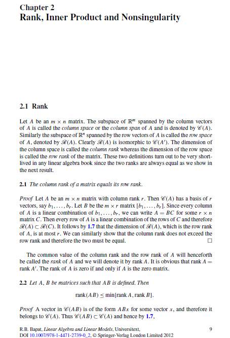 Linear Algebra and Linear Models Authors: R.B. Bapat ISBN: 978-1-4471-2738-3 (Print) 978-1-4471-2739-0 (Online)