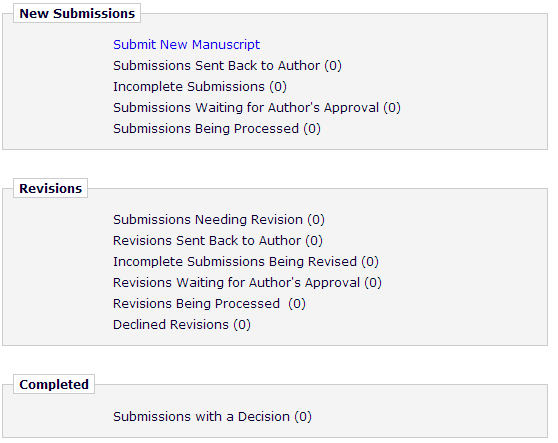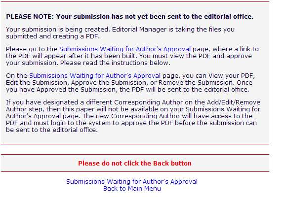 完整的界面是这个样子,我应该点Submissions Waiting for Author's Approval还是Back to Main Menu。我昨天已经提交过一次,就出现这个界面,返回后只找到这个界面(见图2),都是显示0呢。请教你一下,十分感谢