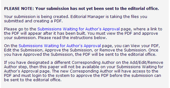 仔细看Please Note下的最后一段(第三段):如果你设定了另外的作者作为通讯作者,那么。。。所以这会儿应该在通讯作者的投稿系统里去确认提交,很多杂志都是这种投稿界面。