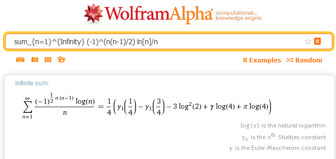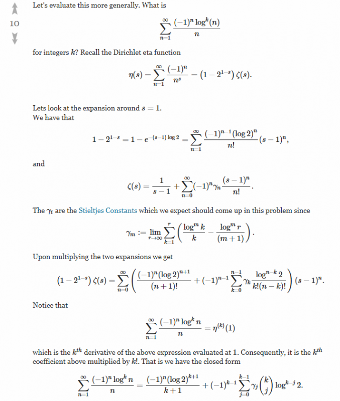 [latex]\sum\limits_{n=1}^{+\infty}(-1)^n\frac{\ln n}{n}=\left(\gamma-\frac{1}{2}\ln 2\right)\ln 2[/latex]