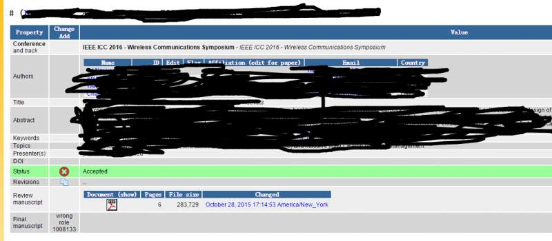 目前WCS已经可以通过https://edas.info/addPresenter.php?m=XXXXXXXXXX (X替换为论文)添加presenter,在https://edas.info/createVisaLetter.php?p=YYYYY&m=XXXXXXXXXX (Y替换为作者编号,X替换为论文编号)显示You need to provide your registration code. 另外在Paper页面出现了visa letter选项,但显示Need to pay for registration first. 根据WCNC 2016的经验貌似这是暂时accepted的迹象(之前有多人反映过可以添加presenter但后来又不能添加并最终被拒的情况)。现在距离最后通知还有两周时间,一切还都不好说,不同track的进度也不同,现在还没法区分"没出结果"和"被拒",大家都投的哪个track?情况如何?