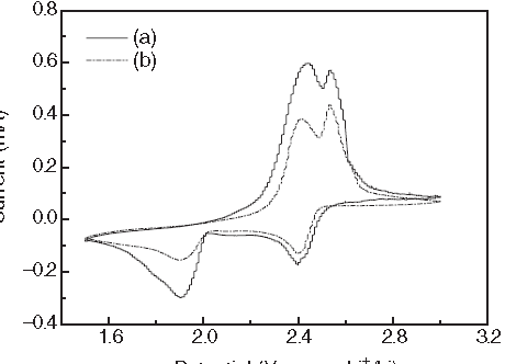大家看一下,这个cv曲线的氧化峰为什么有两个小峰啊,一般情况下不应该是一个峰么。这是我看的一篇文献上的,没有给解释,基本电池情况介绍一下,锂硫电池,硫正极添加纳米氧化铝,外面的是没添加纳米氧化铝的。还有一点,文献说,添加氧化铝的氧化还原峰面积大,他的电容量大,但是看图他的面积没有不含氧化铝的大啊,各位虫友懂得能不能解释一下啊,本人小白一个。谢谢各位了。