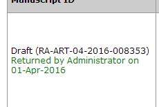 第一次投的RSC advanced,上午提交的稿件,显示的是 1 Submitted Manuscripts,刚才查状态时显示1Unsubmitted and Manuscripts in Draft,也就是未提交。下面显示Returned by Administrator ,是怎么回事呢?高手求助,急!