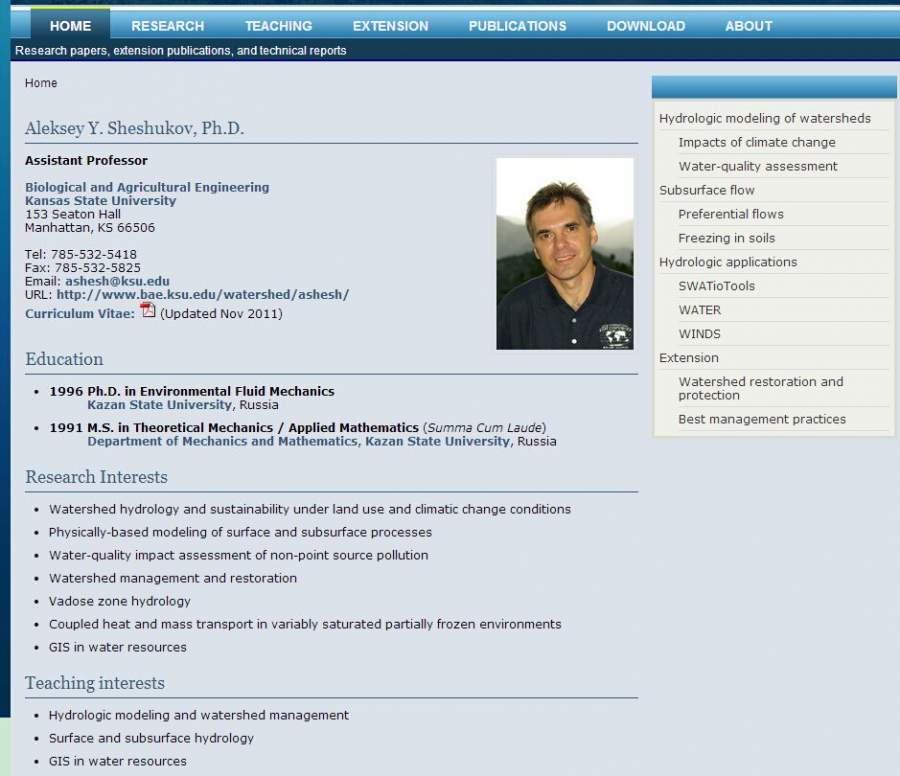 有兴趣到美国做水文模型的朋友,我认识的一位国外老板Dr. Aleksey Y. Sheshukov(Kansas State University)目前想和国内合作,具体包括水文模型、气候变化、GIS在水资源方面的应用等方面。有愿意过来做联合培养博士生或者访问学者的博士生或者科研人员,可以直接和他联系,商量相关留学事宜。他的邮箱是ashesh@ksu.edu。他的研究兴趣、简历等详细信息如下: https://www.bae.ksu.edu/watershed/ashesh/。