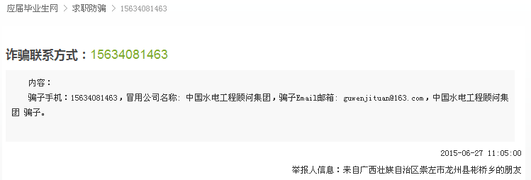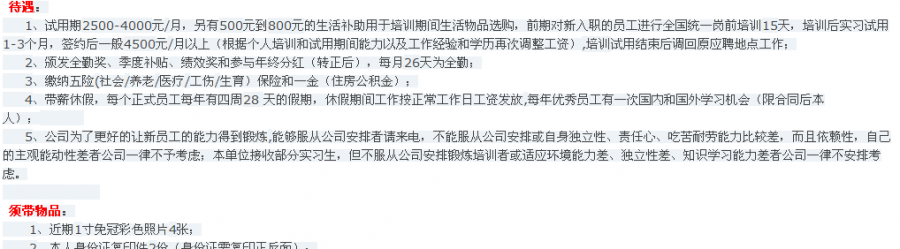 在中华英才网上投递简历,隔天就收到好多面试邀请,内容千篇一律,无非就是邀请面试,先电话跟部门的人联系,待电话面试通过后有15天的培训,但由于面向全国招聘,培训地点统一定在哪儿哪儿,培训完再调回原招聘地。其中有一个百度到有人举报时骗局。
