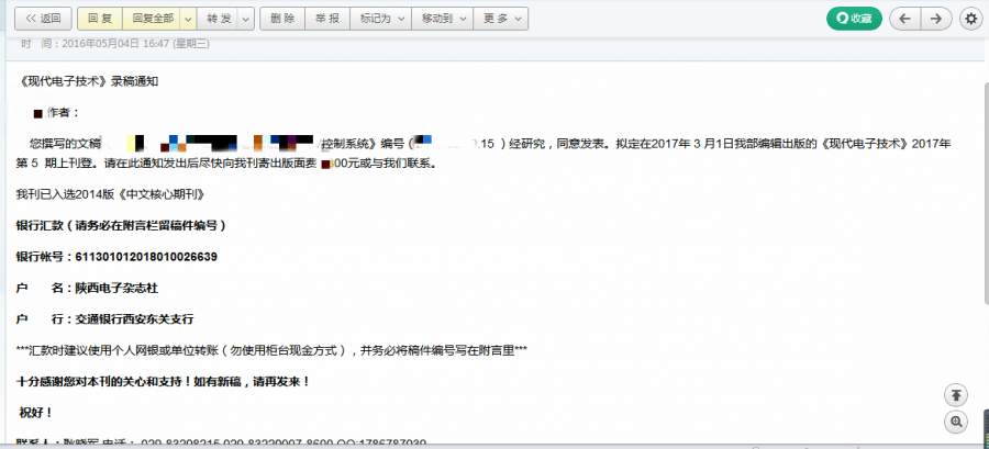 小论文录了《现代电子技术》期刊,老师要求自己先垫钱,然后凭发票和录用通知报销,那么问题来了,我打电话去杂志社,一直无人接听,我现在不敢转账过去,怕开过来的发票不对,没法报销,我想和杂志社说明下我对发票的要求和要录用通知啊,求助怎么办?有投过的兄弟姐妹,知道收到录用邮件,多少天之内转账?现在电话打不通,我怕转账迟了,论文不给我发,急求。另外,看论坛里有些人投稿被骗,本人第一次投稿,有点怕,大家帮我分析下,这个通知是真的吗?