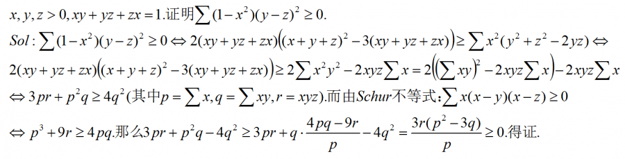 [latex]xyz(x+y)(y+z)(z+x)-(1-x^2)(1-y^2)(1-z^2)=\frac{1}{2}\left((1-x^2)(y-z)^2+(1-y^2)(z-x)^2+(1-z^2)(x-y)^2\right)[/latex]