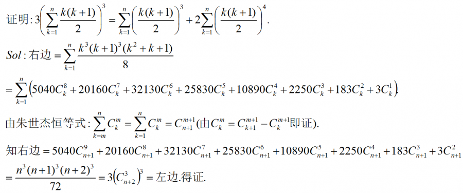 让m=3, 就有[latex]{\binom{n+2}{3}}^3=\sum_{k=1}^{n}{\binom{k+1}{2}}^{3}\frac{k^2+k+1}{3} [/latex]