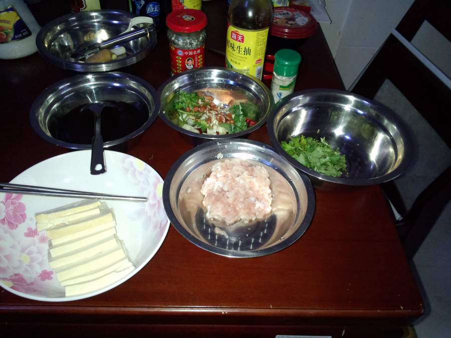 老豆腐、粉丝、猪肉、豆芽、花生米、菜籽油、盐、生抽、老抽、生姜、香菜、蒜头,料酒