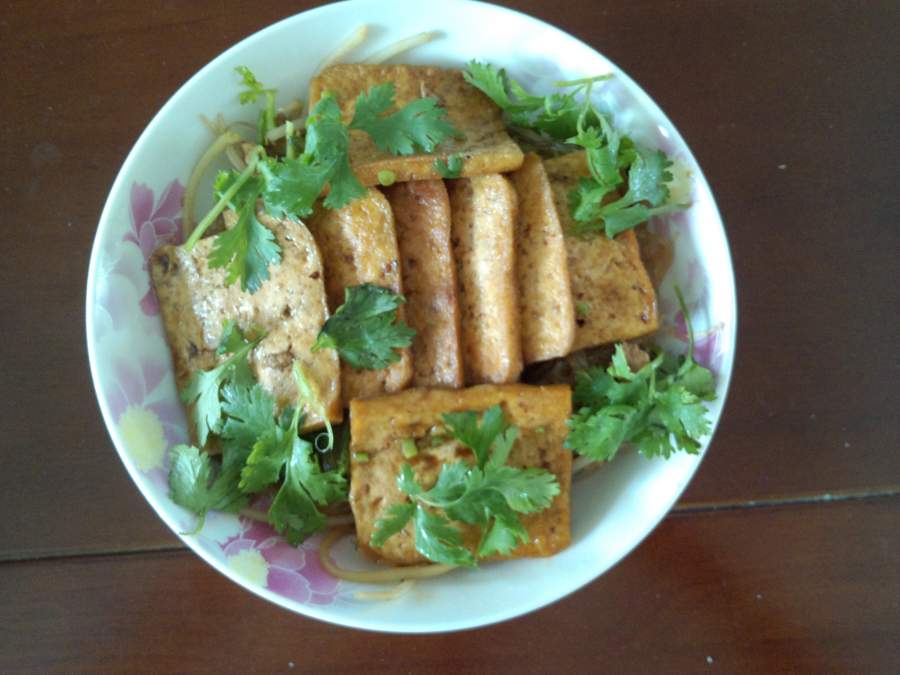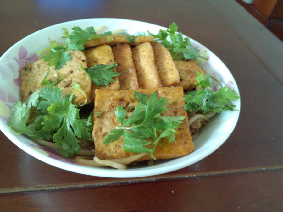 9、将肉末粉丝盛起装盘,撒入准备好的花生米沫和香菜叶。在汤中加入炸好的老豆腐,再中大火煮3min收汤。