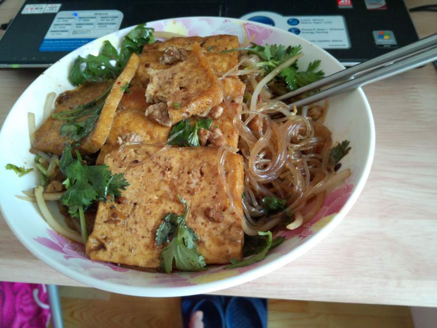我很喜欢这道菜,味道不错,营养丰富。粉丝是淀粉做的,糖类,肉和豆腐分别含有肉质蛋白、脂肪和大豆蛋白,豆芽还有丰富的纤维素和维生素。