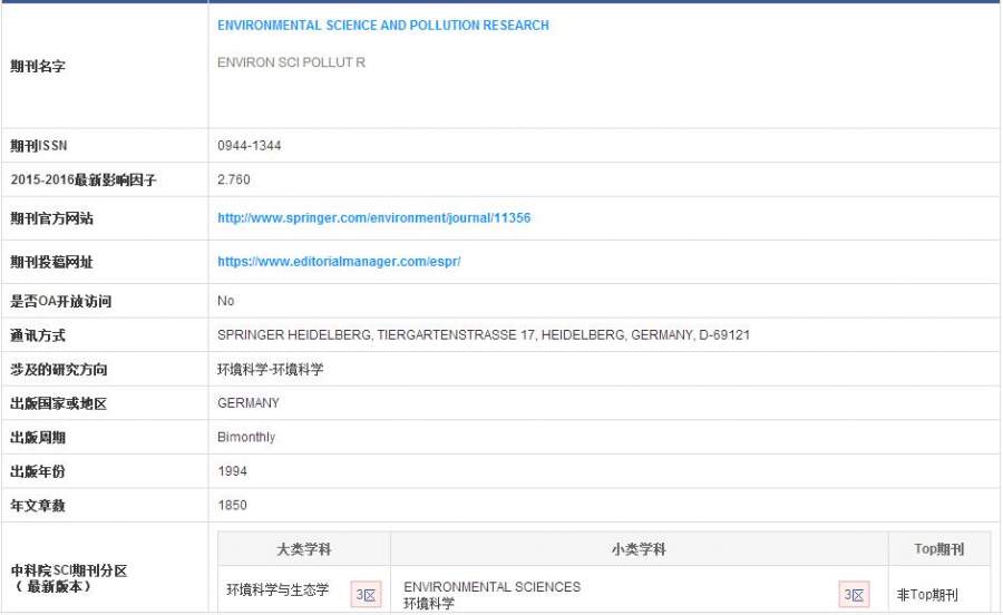 JCR杂志分区 环境科学分类下的2 区期刊. 中科院杂志分区 所属大类别:环境科学与生态学 3区、 所属小分类: 环境科学 3区