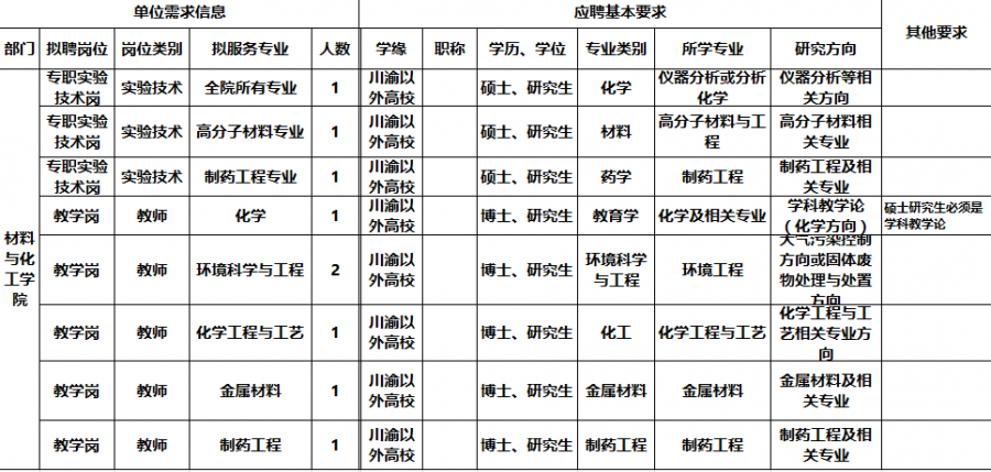 重庆文理学院 材料与化工学院2016-2017年度人才需求计划,欢迎应聘!