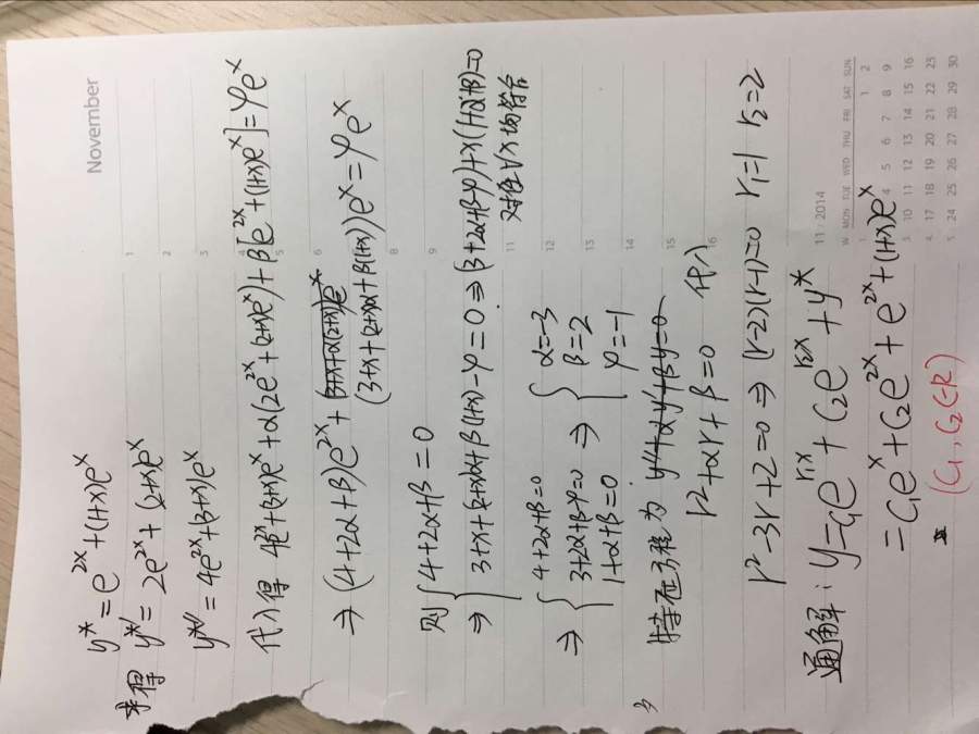 常系数二阶非齐次的可以先求齐次方程的通解,再求出一个非其次方程的特解,两个加起来就可以了。