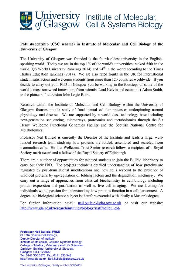 研究所主任是Neil Bulleid教授,他是惠康基金(Wellcome Trust)的高级研究员、苏格兰皇家学会院士,曾荣获皇家学会杰出奖。Bulleid教授领导着一个资金充裕、人员配置合理的研究小组,对哺乳细胞的蛋白质如何折叠、装配和分泌展开长期研究。Bulleid教授是本次所招博士生的导师。