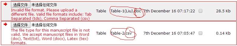 我投稿的时候表格是单独放在了一个word中,系统提示我格式不对,要上传csv格式的,我又用Excel做了一个csv格式的表格上传,他提示我上传doc格式,就这样无尽循环!!!!求发过这个期刊的大神的帮助!!!