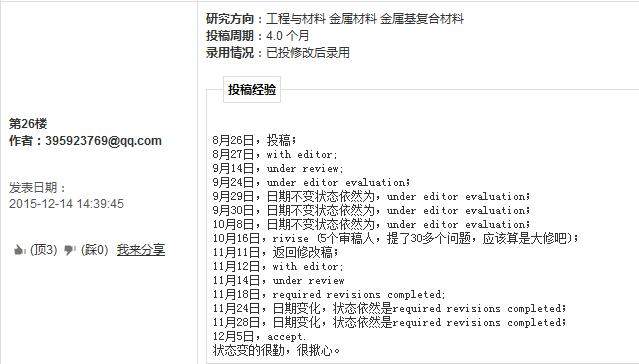 楼主,总结到了各种情况。昨天晚上11点投了一篇Elsevier,12点under review,今早10点20状态改为with editor evaluation.怎么会这么快,好紧张啊,希望有个好结果,祈福~~~或许我应该相信自己的论文,加油,
