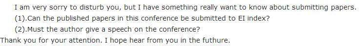 因为快要毕业了,老师让我投一个会议,但是小弟现在就是有点疑问,(1).这个会议的文章是不是会被EI收录,如果收录怎么查寻,(2)怎么查询在这个会议上投稿的文章, (3)这个会议要求文章最长只要6页,就是我现在写了17页应该怎么删减。因为人家的主页上没有显示文章是否会被EI收录于是我就是发邮件问了下会议主办方的主席,