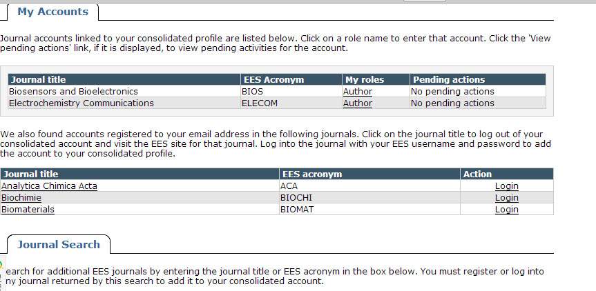 几年前在Biomaterials发过一篇,今天打算投稿,怎么都登不进去,各种方法都试了,说说要合并EES账户,近了其中一个,显示如截图,有两个是正常合并的账号,下面三个杂志包括Biomaterials在内都显示如图,按照说明点击杂志名又回到之前的登陆界面,用户名密码依然无法登陆,希望有相同经历的友友帮帮忙说说具体操作流程,谢谢!