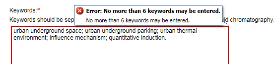 投稿艾斯维尔期刊,投稿系统在关键词哪里总是提醒超过6个关键词,可是我只有5个关键词,也用分号进行了分割,请问怎么解决? 应该不是6个单词吧,看期刊以往发表的论文都不是6个单词的。 返回小木虫查看更多